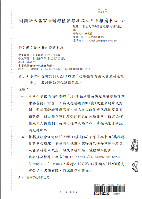 時間:114年10月28日(星期二)下午2時至5時。 地點:財團法人器官捐贈移植登錄及病人自主推廣中心6樓視聽會議中心,採同步視訊。 報名方式:線上報名(網址: https://e-learning-torsc.formosasoft.com/ ),即日起至114年10月23日(星期四)下午5時止,額滿將提前截止。 附上議程表-議程.pdf 如有活動相關疑義,請逕洽該中心聯絡人石小姐,電話:02-23582088 #226。