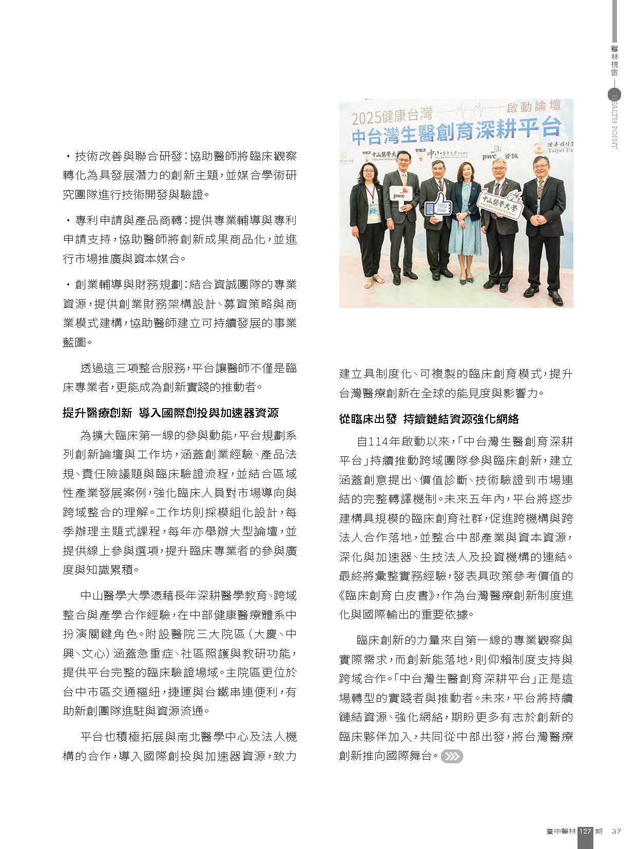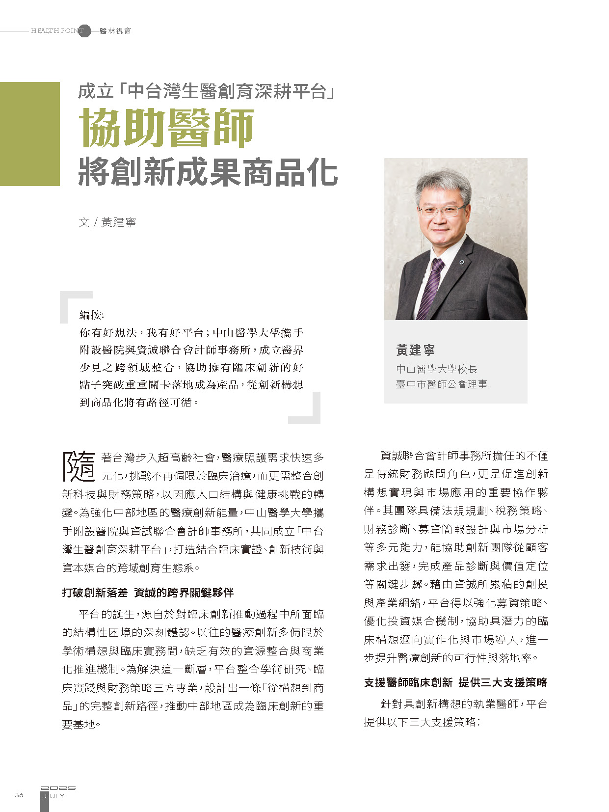 - 成立「中台灣生醫創育深耕平台」 協助醫師將創新成果商品化