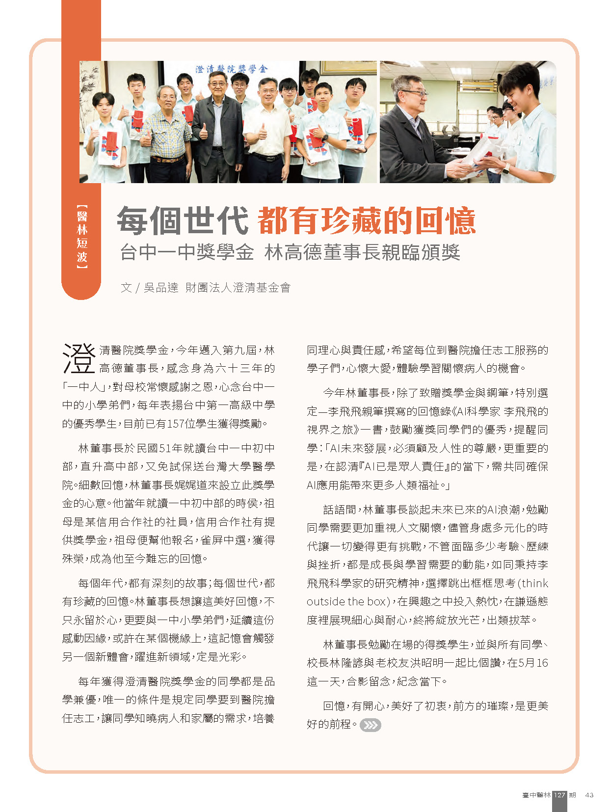 每個世代都有珍藏的回憶 台中一中獎學金 林高德董事長親臨頒獎 |