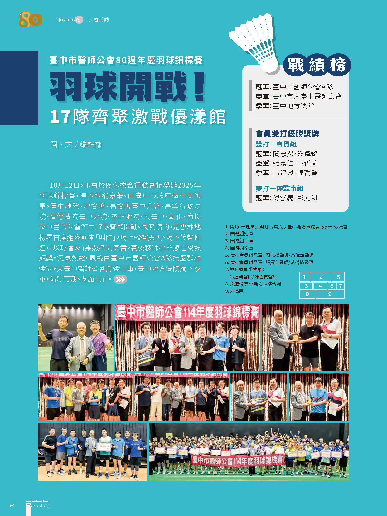 • 臺中市醫師公會80週年慶羽球錦標賽 羽球開戰!17隊齊聚激戰優漾館