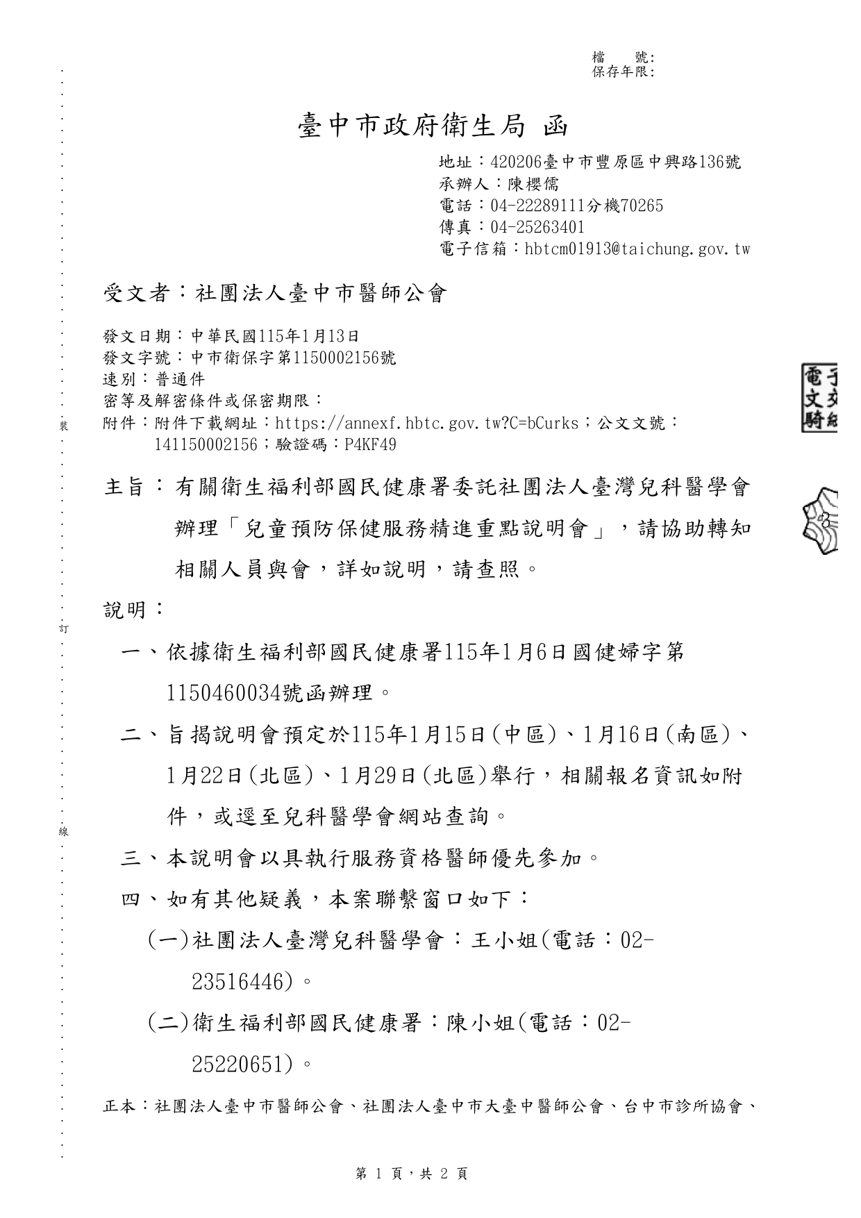 臺中市政府衛生局轉知衛福部國建署辦理「兒童預防保健服務精進重點說明會」