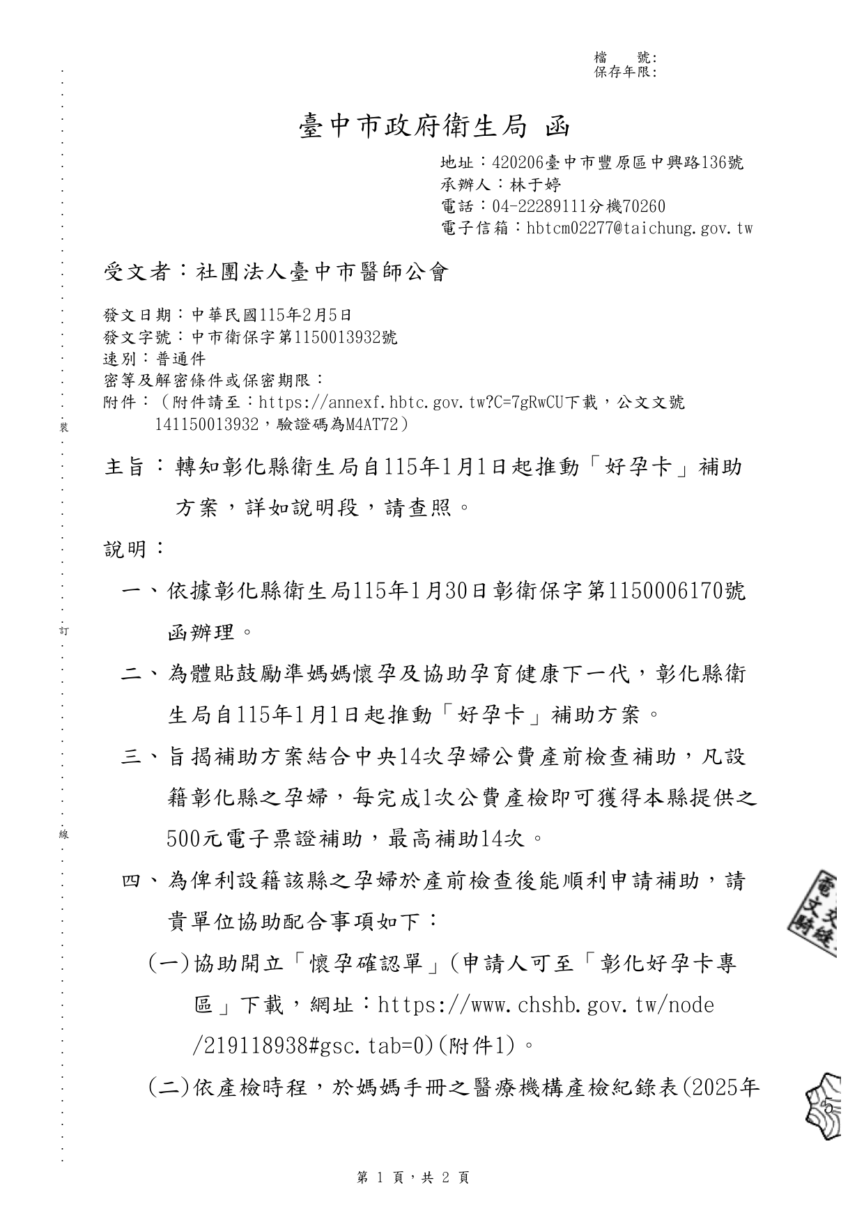 轉知彰化縣衛生局自115年1月1日起推動「好孕卡」補助 方案