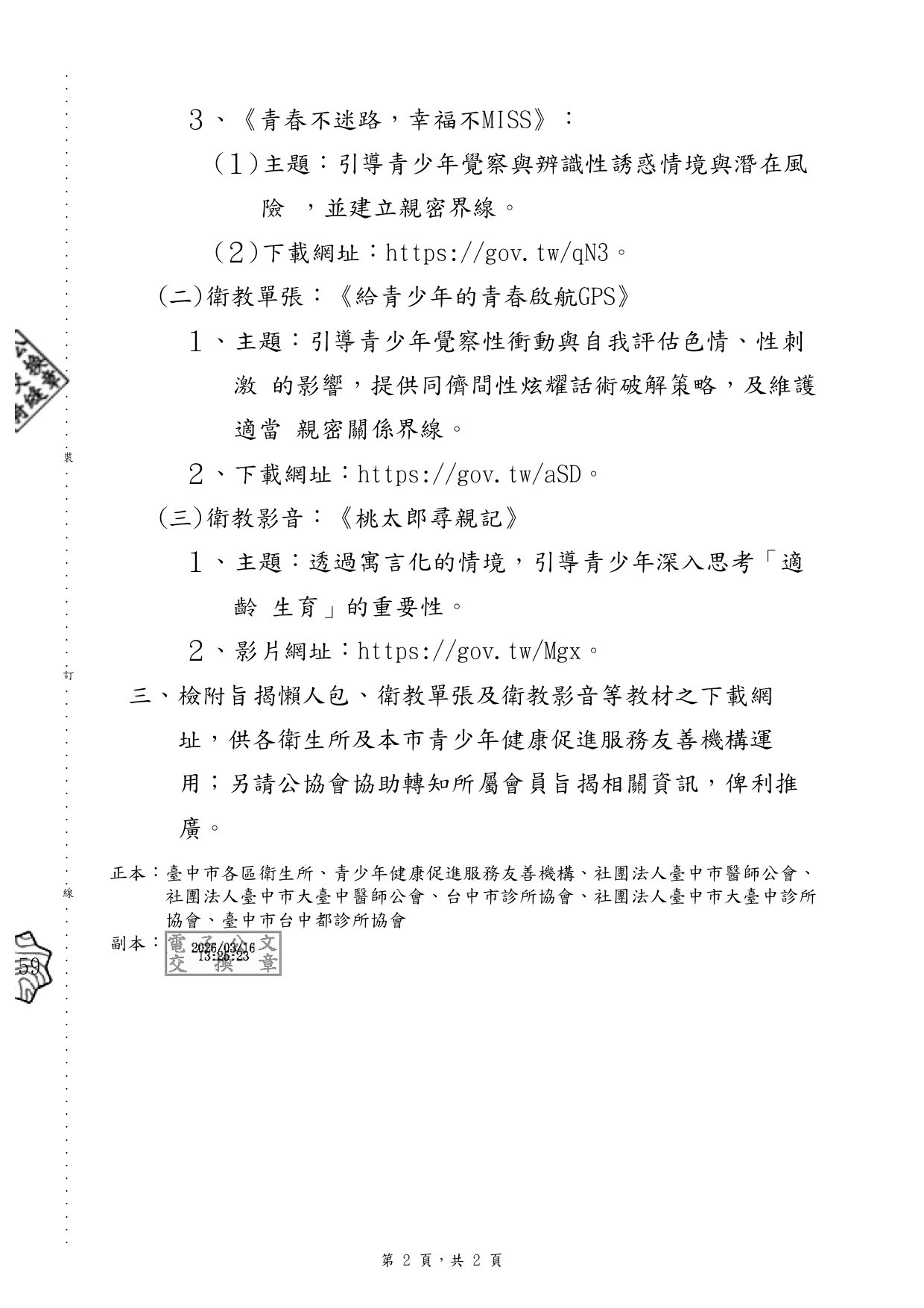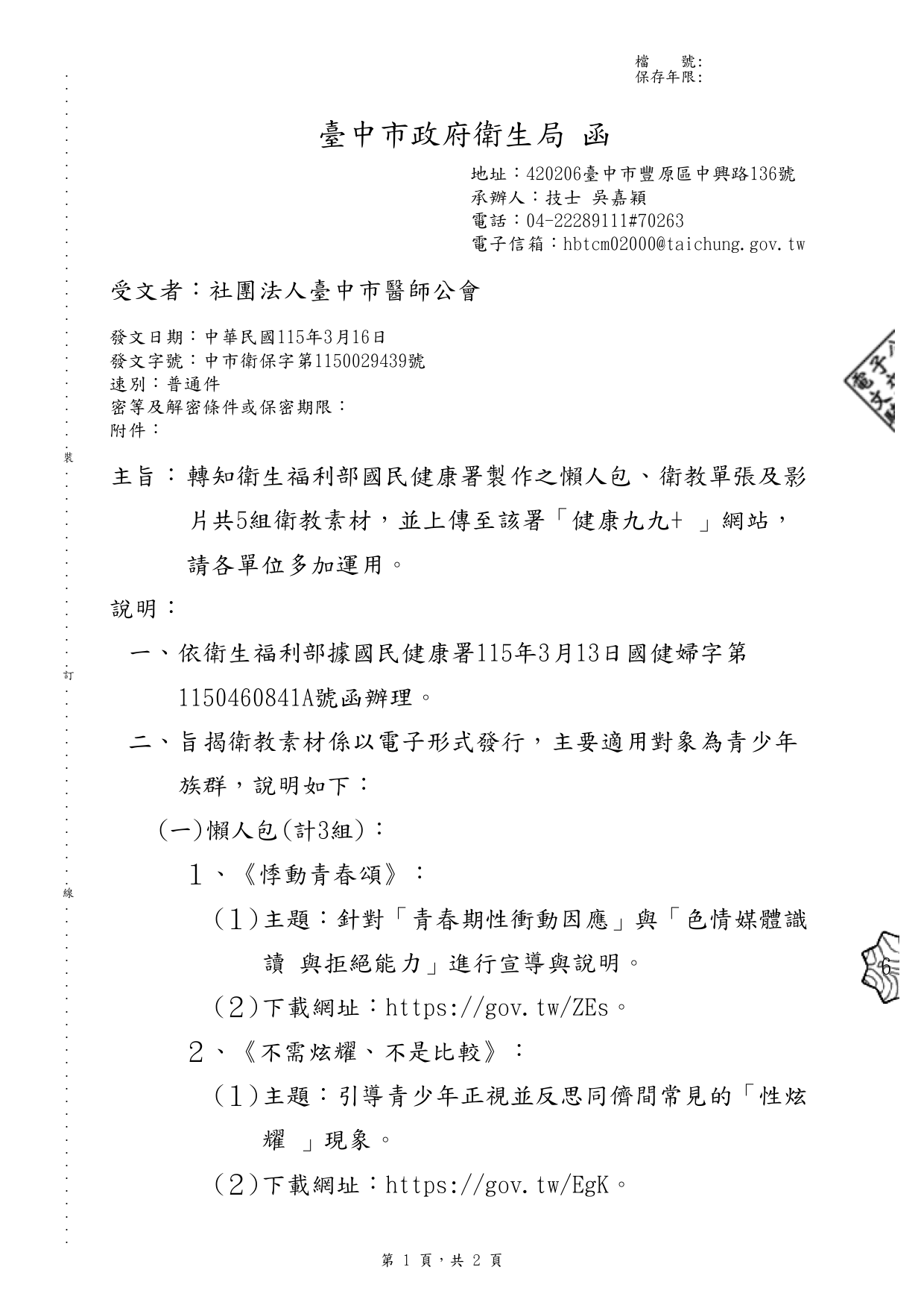 轉知衛生福利部國民健康署製作之懶人包、衛教單張及影 片共5組衛教素材,並上傳至該署「健康九九+ 」網站, 請各單位多加運用。