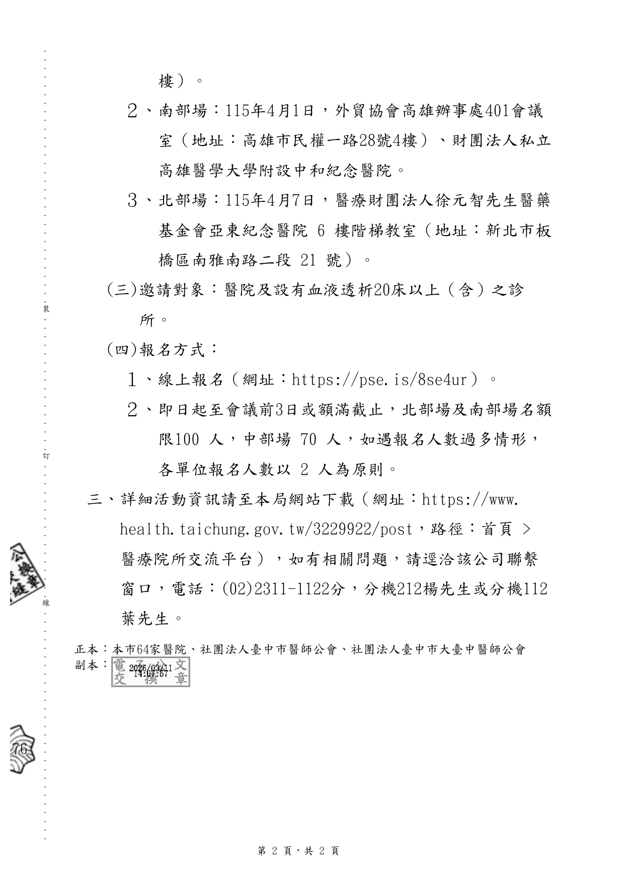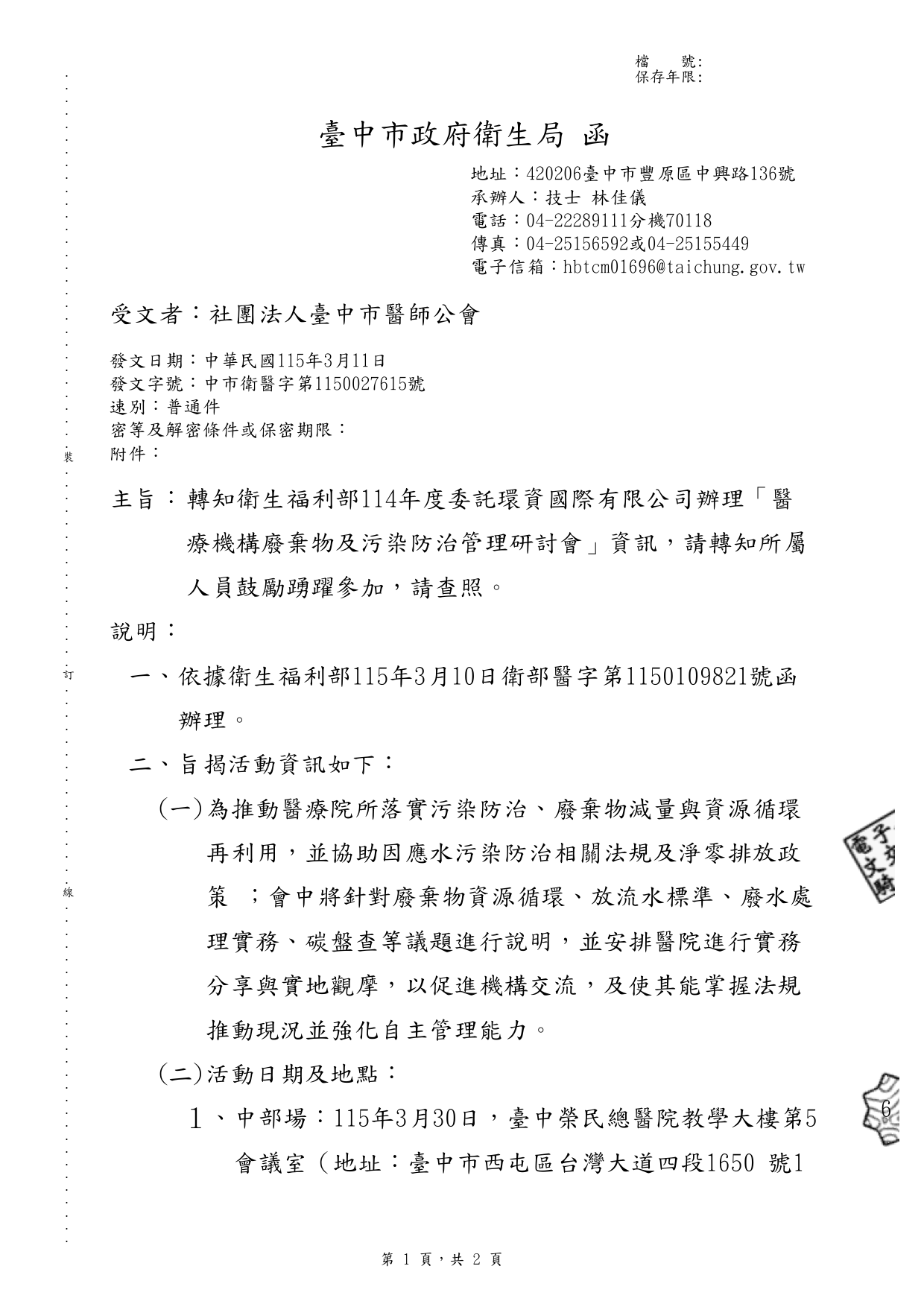 轉知衛生福利部114年度委託環資國際有限公司辦理「醫 療機構廢棄物及污染防治管理研討會」資訊,請轉知所屬 人員鼓勵踴躍參加