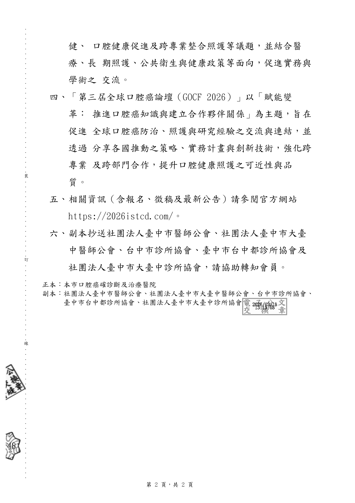 函轉高雄醫學大學辦理「2026年第三屆咀嚼吞嚥困難跨領 域照護國際研討會(ISTCD 2026)」暨「第三屆全球口腔 癌論壇(GOCF 2026)」資訊