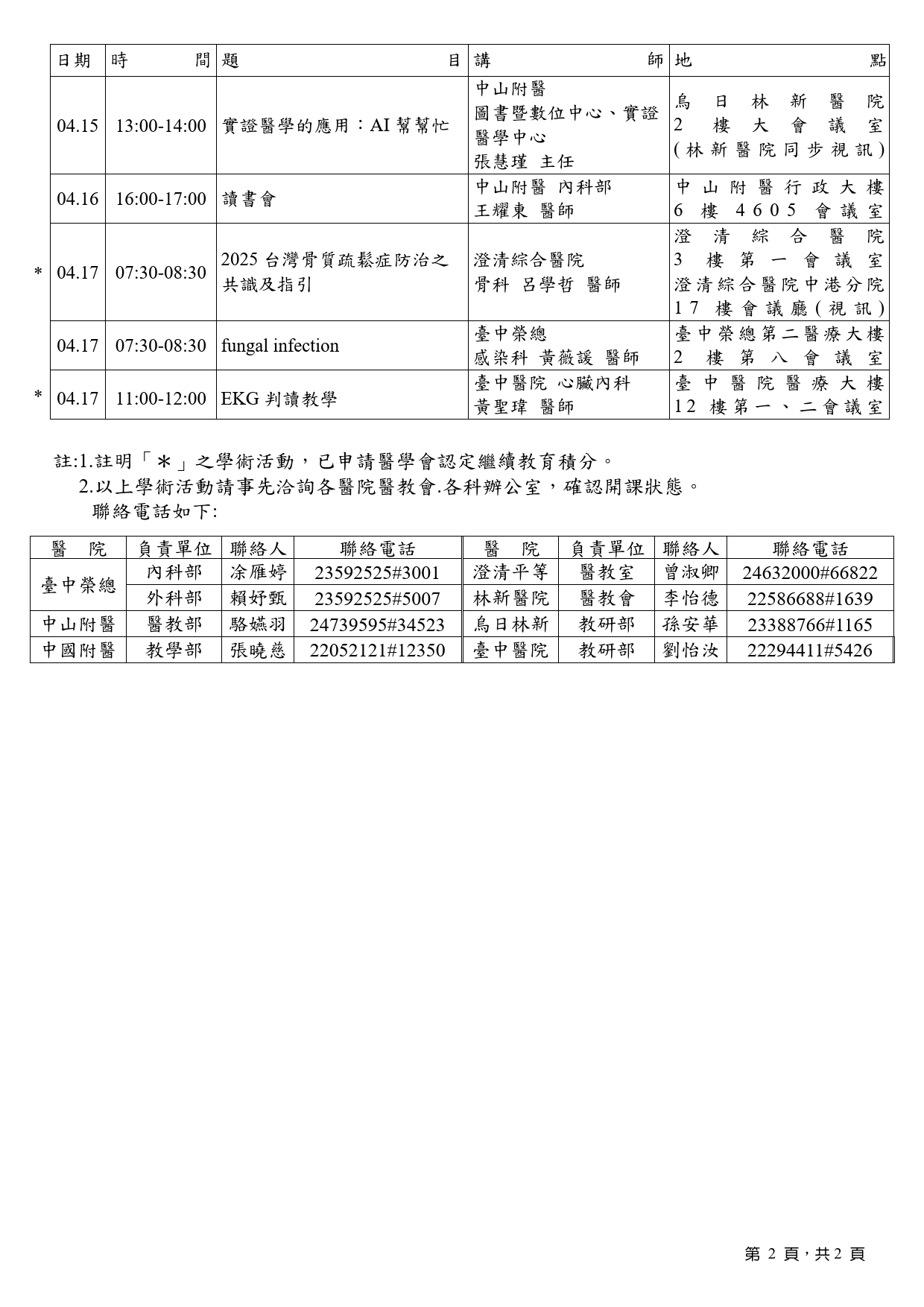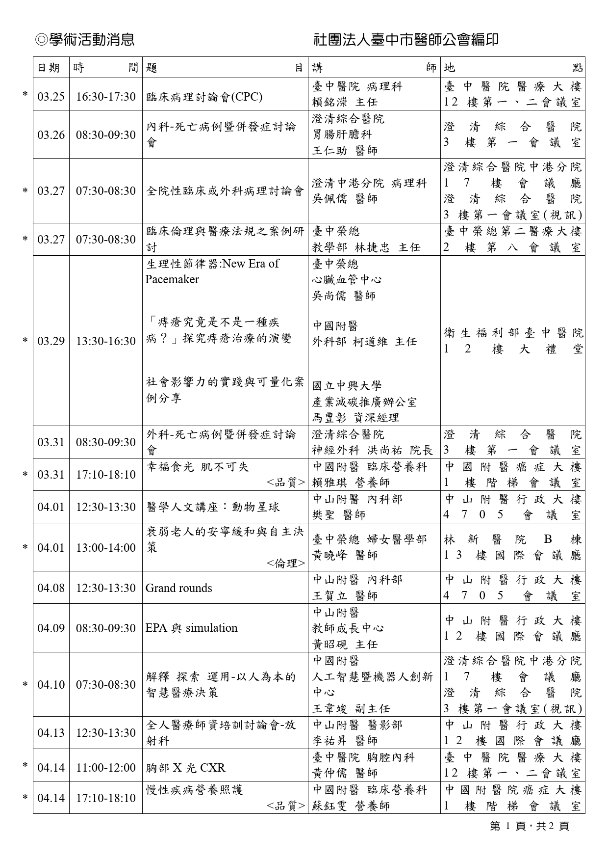 3月份學術演講會排程表