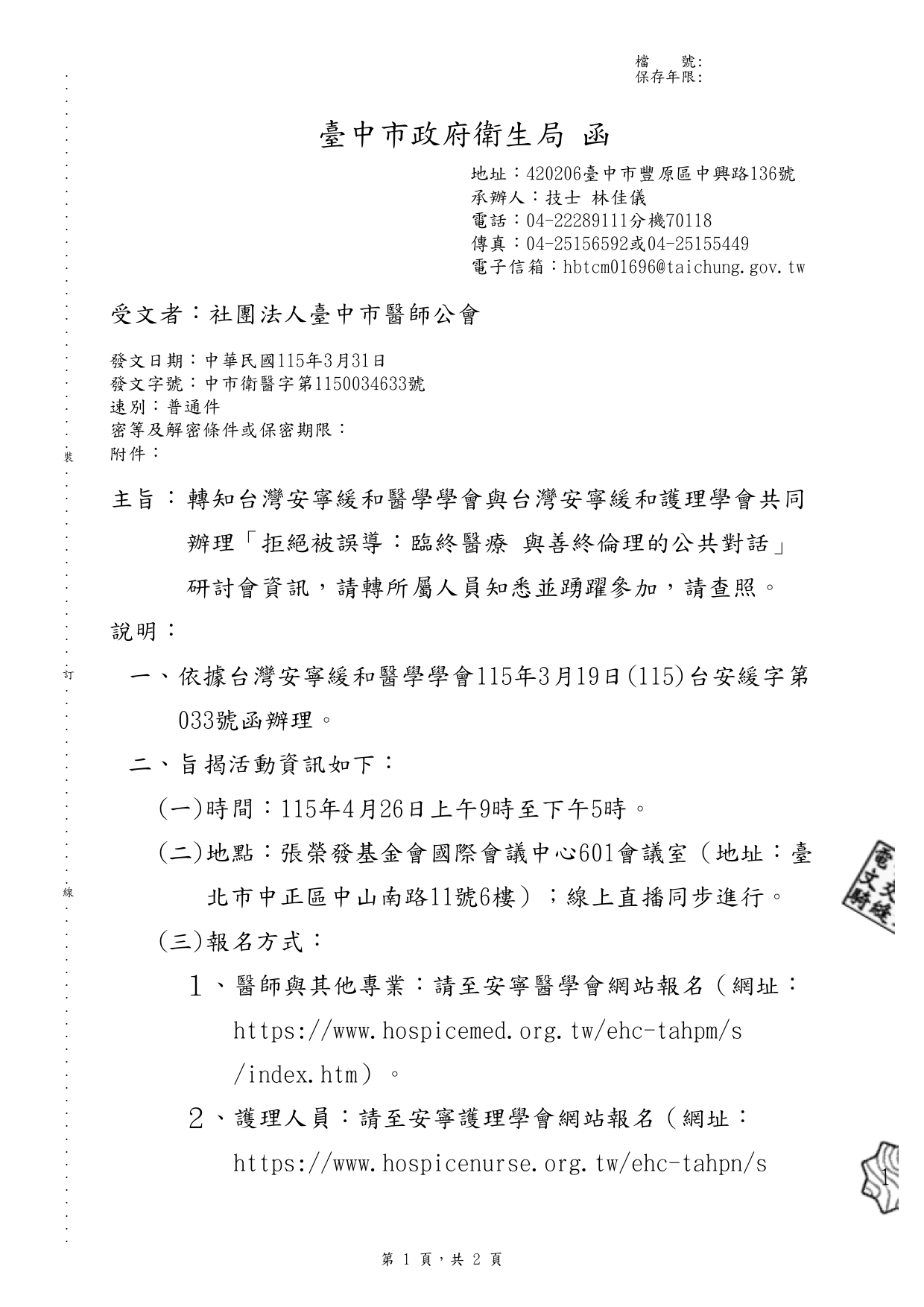 報名網址:https://www.hospicemed.org.tw/ehc-tahpm/s/index.htm 學會網站:https://www.health.taichung.gov.tw/3243679/post