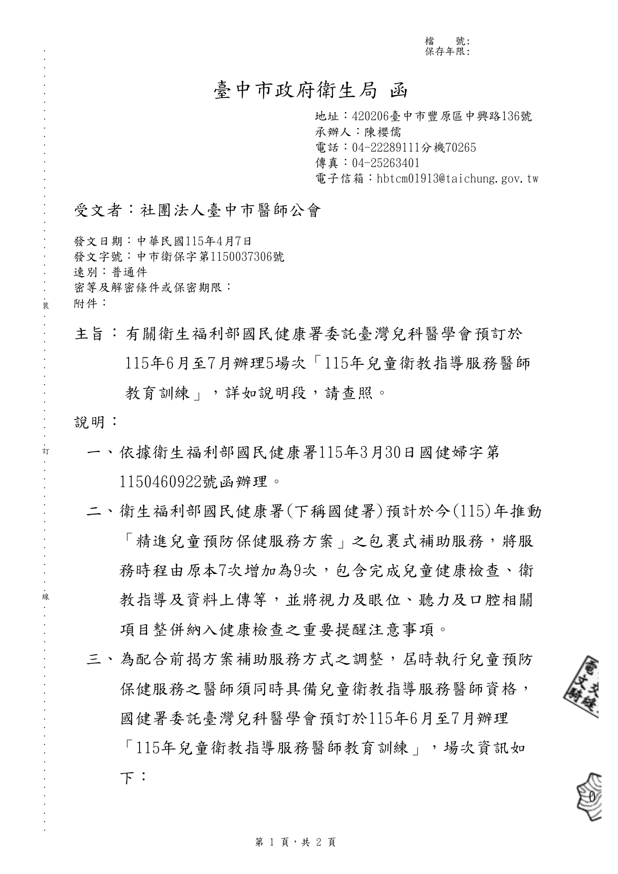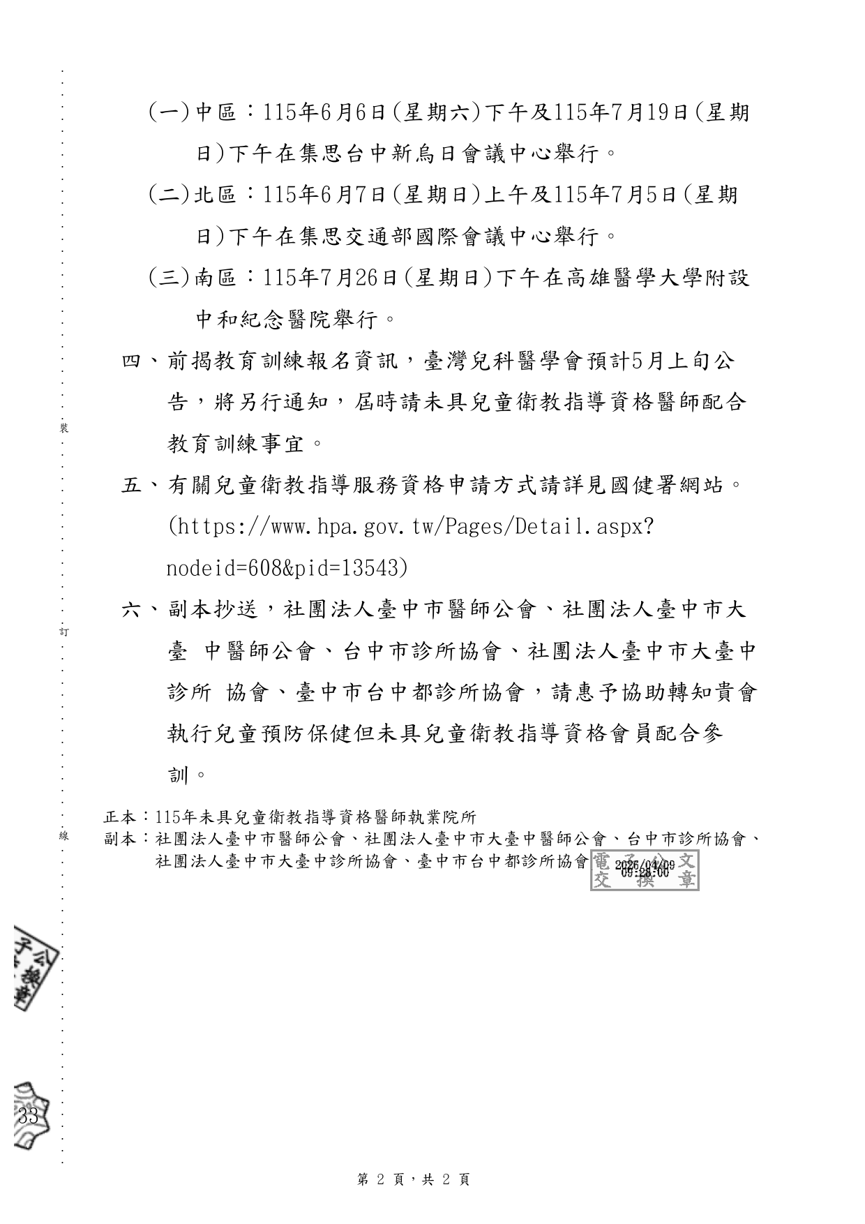 衛生福利部國民健康署委託臺灣兒科醫學會預訂於 115年6月至7月辦理5場次「115年兒童衛教指導服務醫師 教育訓練」