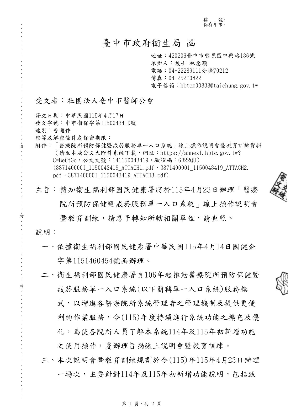 衛生福利部國民健康署將於115年4月23日辦理「醫療院所預防保健暨戒菸服務單一入口系統」線上操作說明會 暨教育訓練
