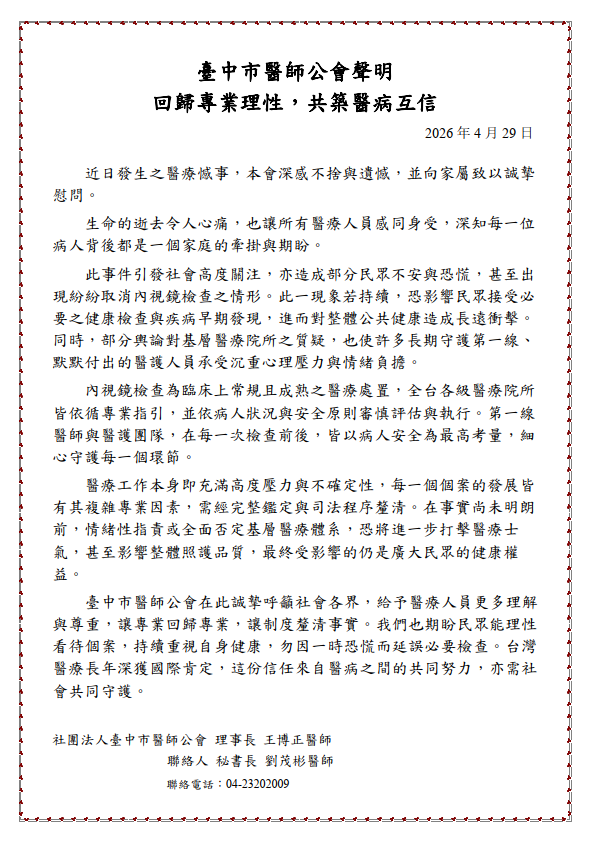 【臺中市醫師公會聲明】 回歸專業理性,共築醫病互信